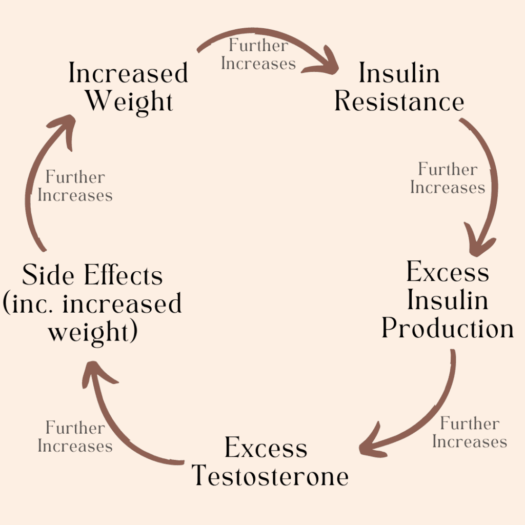 But, the catch is that PCOS is associated with quite a vicious cycle (pictured below). Where increased weight cycles back and exacerbates the insulin resistance. Then increased insulin resistance in turn increases insulin production. Then the increased insulin production cycles back and further exacerbates the increased testosterone production. This all has an effect on the body and causes the aforementioned side effects.